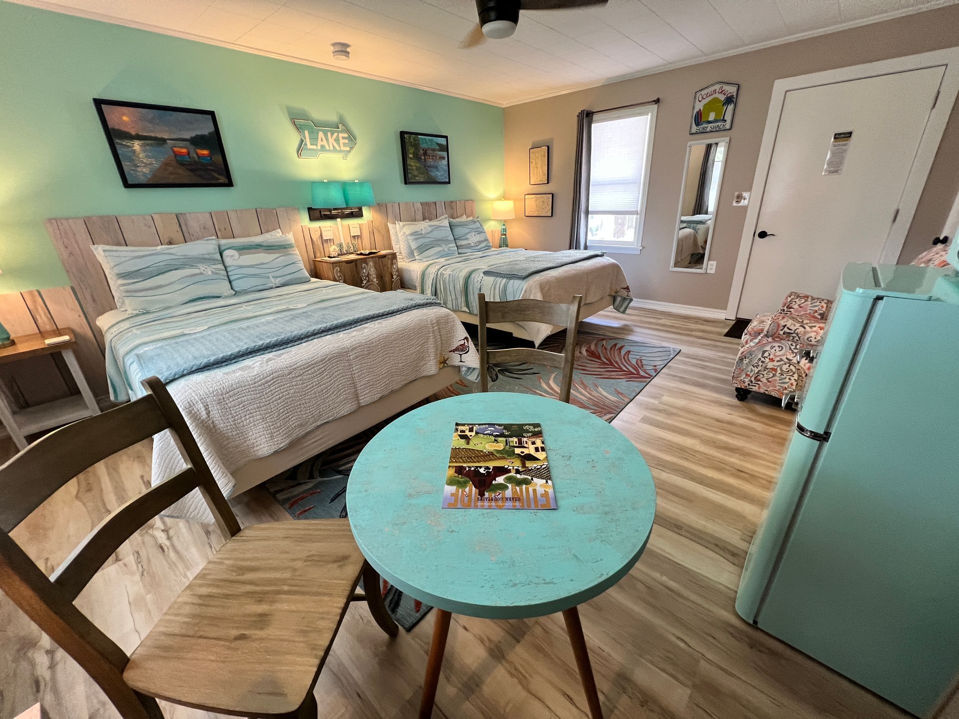 Newly renovated in 2024, The Magnolia Suite offers comfort throughout! Perfect for couples, friends traveling together and families with kids. This double queen room is spacious and comfortable, featuring Serta Perfect Sleeper mattress sets with an "Earthy" design motif, small table with chairs and a separate mini-bar area complete with countertop for coffee, microwave, dishes, etc. It features a full bath with tub, as well.